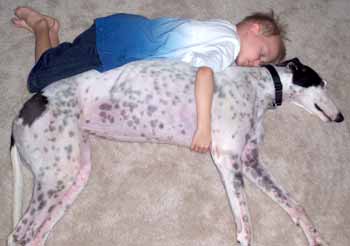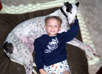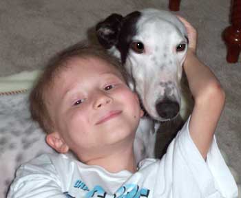 Back in March, 2002, GALT received an adoption application from a couple, Tom and Tricia Thomas, and their five-year-old son, Ian. They lived near Gainesville, and were in the process of finishing their fence. It was agreed that they would wait to choose a greyhound until their fence was completed and their yard was secured. GALT checked with them periodically about the fence progress. Then one terrible day, an e-mail arrived from Tom that said they would have to put the adoption on hold because their son had been diagnosed with leukemia. Tom was confident that a greyhound would be in their future but just not at that time. They knew they had a rough road ahead of them. GALT, of course, would wait and hope for the best for them. GALT occasionally inquired about Ian's progress.