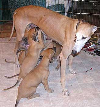 Trixie's pups have once again grown overnight. When we looked in their pen at 6:15 a.m. we saw that their systems were working VERY WELL - especially their digestive and urinary tracts. They were so happy to see us and Trixie. She is such a great mom! She is eager to go into the pen and nurse her babies. It's so funny to see her standing while they sit up on their haunches to eat. No laying down for this mom! She must be one of these new-age moms. Weaning time is near.