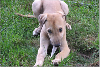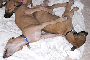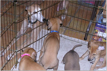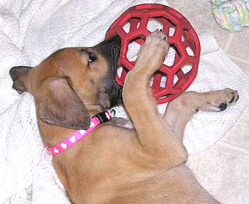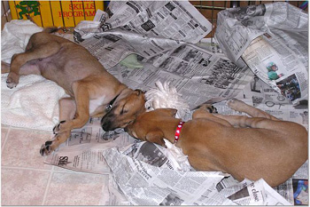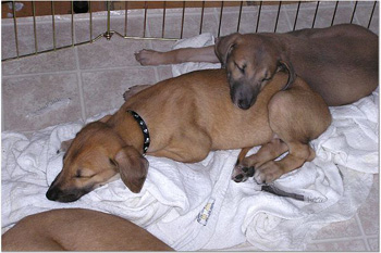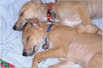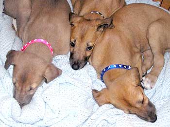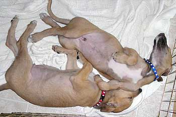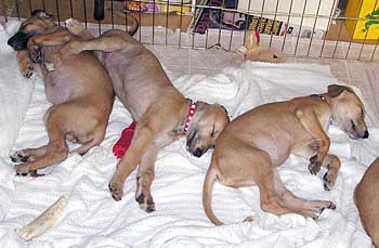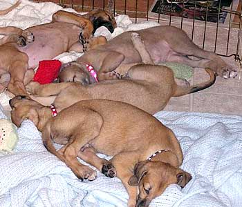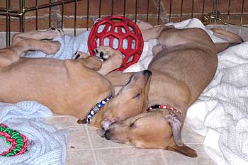 After breakfast they played their little puppy heads off! They jump on each other and jump and miss and tumble and crash into the sides of the pen for about 45 minutes. This may be the first litter of greyhound puppies with docked tails because their siblings have chewed them off. They are so funny to watch play with each other and with their toys that you can hardly pull yourself away. It's incredible to see how they're learning about the world around them. After 45 minutes they suddenly collapse with puppy smiles and are dead to the world around them. Their little feet move like they're running in their dreams. Often they'll commando crawl to find a more comfortable spot usually next to one of their siblings. Our naps (theirs and mine) usually last about an hour or an hour and a half.