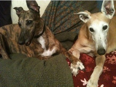 Sophie came into our home when her foster mom took a week's vacation. We love the bittersweet job of fostering Greys who are transitioning to a new and happier chapter in their life -- finding their forever home. It requires guarding your heart while you perform the sweet duty of preparing them for life in a human's house. Sophie was different than all the others. She was scared, hand-shy especially of men, but so sweet. A big cuddler and big on kissing your hand when she approached. She easily took her place next to our greyhound, Velcro and even won over the queen of the house, lab mix Sami -- not an easy feat!