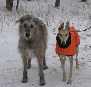 Tizer, aka Turbo B Tiger and nka Turbo, was adopted the week before Christmas in Plano. He made the long drive back with his forever family to their home on the shores of Deep Creek Lake in the mountains of western Maryland, which he happily shares with a small orange cat and a large Irish Wolfhound. Here he is adapting to the cold winter climate with his new best friend Teagan.