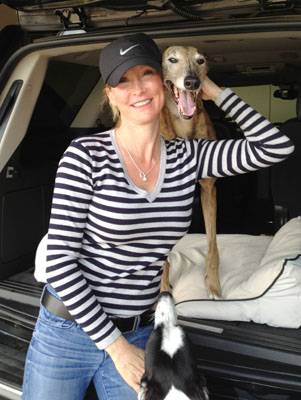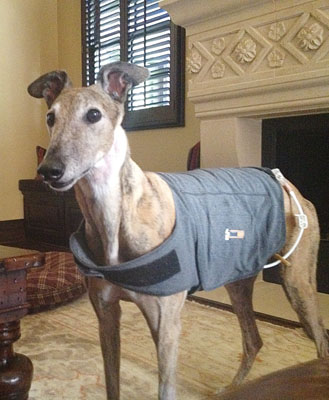 While in Pennsylvania, they decided to adopt another greyhound - Coyote (aka "Kiowa Cry Coyote") - a three-year-old white grey with black eye patches and ticking. Coyote, a grandson of the famous Gable Dodge, was a D racer with five wins out of 47 races in Florida. The Greenbergs adopted him in November 2011, from Fast Friends Greyhound Rescue in Boonsboro, Maryland. In late December of 2011, Chuck and Jenny headed back to Texas with Tyler, Coyote, Holly and Little Jack.