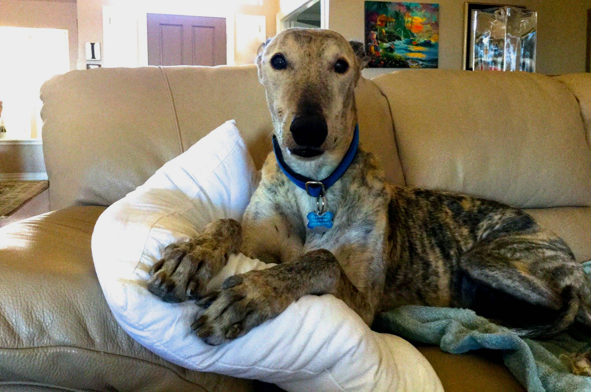 Cher and Chip Imrie recently started this special new program for GALT in memory of their beloved first grey, Blazer, who traveled to the Rainbow Bridge on April 22, 2016. This sweet boy was born on Christmas Day in 2002, and he brought many years of joy to his forever parents and his grey sibling, Silvia. Chip and Cher were devastated by Blazer's passing but decided to do something in his memory to help another GALT grey in need. They decided that Blazer would become the "Guardian Angel" for sweet Victoria, a very small fawn female grey in critical condition who was surrendered by a coyote hunter in Tulia, Texas. Victoria has come a long way after several months in GALT's care, and she is finally through with all of her treatments and medical procedures. Victoria is now ready to hit the Meet and Greet circuit so she can find her forever home! Significant medical expenses have been incurred by GALT to treat her open wound, eye and skin infections, Ehrlichia Canis and severe parasite infections. Read more about Victoria's story here.