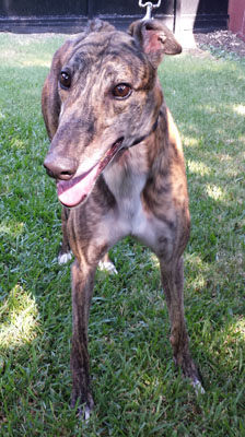 Askew, aka Let Me Ask You, is a 3½-year-old brindle male born October 4, 2009. His sire is Super Lee and his dam is Up N Coming Idol. Askew has 85 races on record at Greyhound-data.com. He started his career at Bluffs Run, IA on May 5, 2011, moved to Wheeling Downs, WV, and then finished up in Pensacola, FL on July 13, 2013.