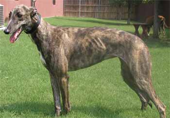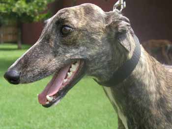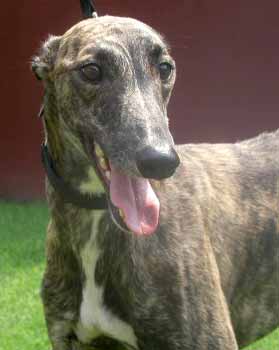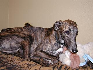Downie, aka Down Bed, is a 1½-year-old beautiful dark brindle female, born April 2001. Downie is a gentle, petite, very affectionate little girl. Although she may be slightly timid at first, she warms up almost instantly. She loves to give kisses, snuggle with people and her stuffed animals, and is usually always wagging her tail. Downie gets along very well with other dogs, large and small, and is also cat friendly.
