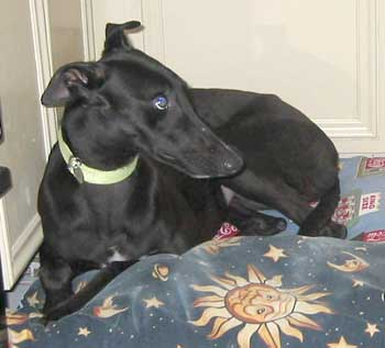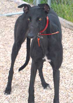 Ember, aka Geaux Foxy Ember, is a beautiful black 2-year-old female born April 19, 2001. Dutch Bahama is Ember's grand sire. She is an extremely shy girl who is in need of a very special home with lots of time and patience to help her adjust to her new life. Another greyhound would be a comfort for her as the company is something she does enjoy, and she seems to find comfort with other animals. She is afraid of men and will do better in a home with women.