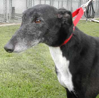 Rooster, aka Gable Rooster, is a 5½-year-old big black handsome male, born October 4, 1996. Rooster's sire is Wigwam Wag, but his racing career did not take off like his dad's - he just wasn't fast enough! He is very affectionate and is ready to find his "forever" home.