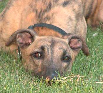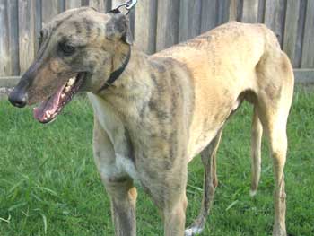 Walt, aka GLB's WalkyTalky, is a three-year-old handsome red brindle male born March 28, 2001. Walt's sire is Gable Dodge and his dam is GLB's Too Sweet. Walt's racing career was all spent here in Texas where he started at October 2, 2002, at Gulf Greyhound Park, then to Valley Race Track in Harlingen, and finished at the Corpus Christi track on July 9, 2003. His whereabouts since that time are unknown. Although Walt gets along well with other dogs, it has not been determined if he is small animal or cat tolerant at this time.