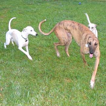 Walt is doing superbly in his foster home! Observations of Walt show that he is VERY dog friendly and extremely playful. He has been having a blast with Winter and Scully, my two whippet siblings. He gets a burst of energy after going "poop" and takes off with a sprint; the girls chase after him barking and he just loves it. He'll spin around real fast and just drop to the ground as they run around him. Then he'll jump up really quick and try to pounce. No agression whatsoever with Walt. Another observation I've made is that Walt is NOT food agressive at all. He loves to play! When we're outside, he'll try to grab my hand gently with his mouth so that I'll keep playing. He is such a happy boy!